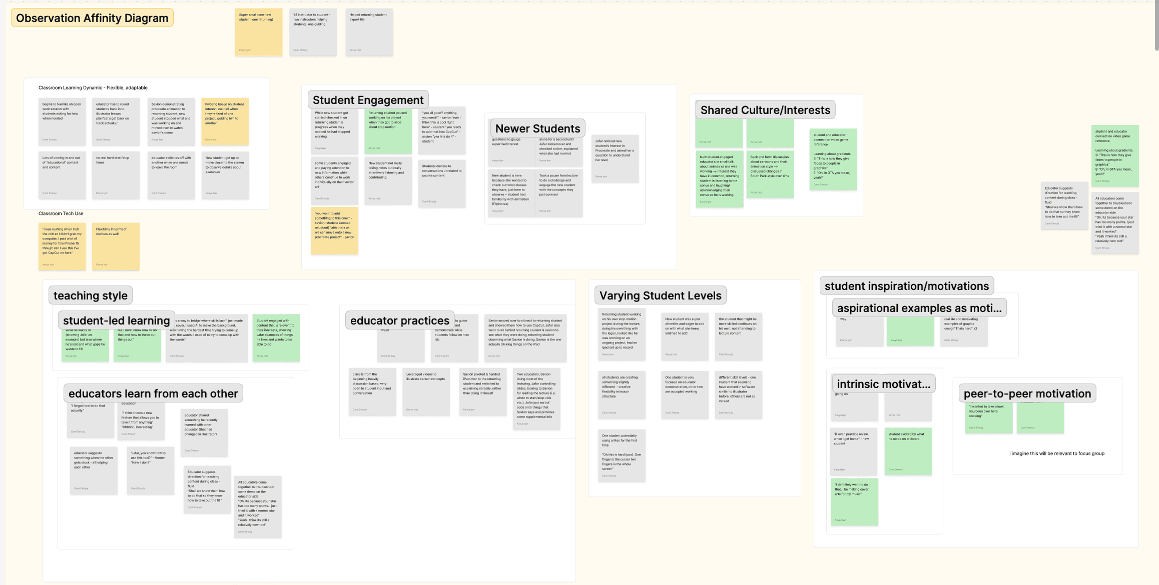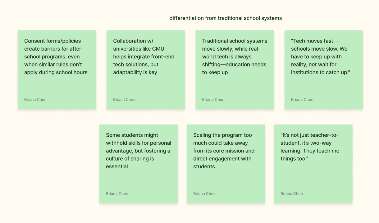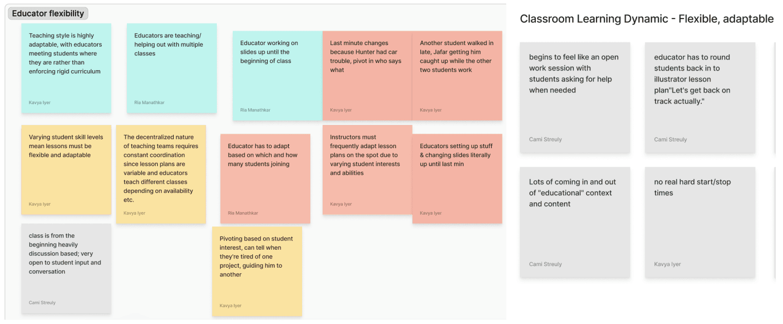 Because students and educators had such limited availability, our research needed to be extremely adaptive, sometimes asking a max 2 questions at a time. We often worked within 5–20 minute windows, which pushed my team and I to refine questions on the fly and focus on learning what truly mattered without disrupting their environment.
