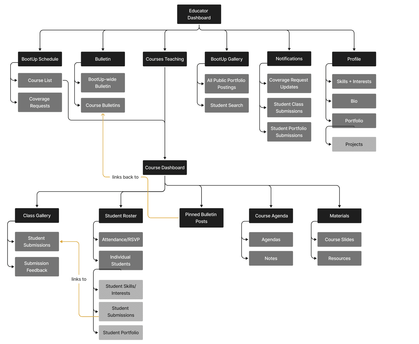 Our final solution is a digital platform that supports educators, administrators, and students in tracking progress, organizing classes, and centralizing student work as BootUp scales.